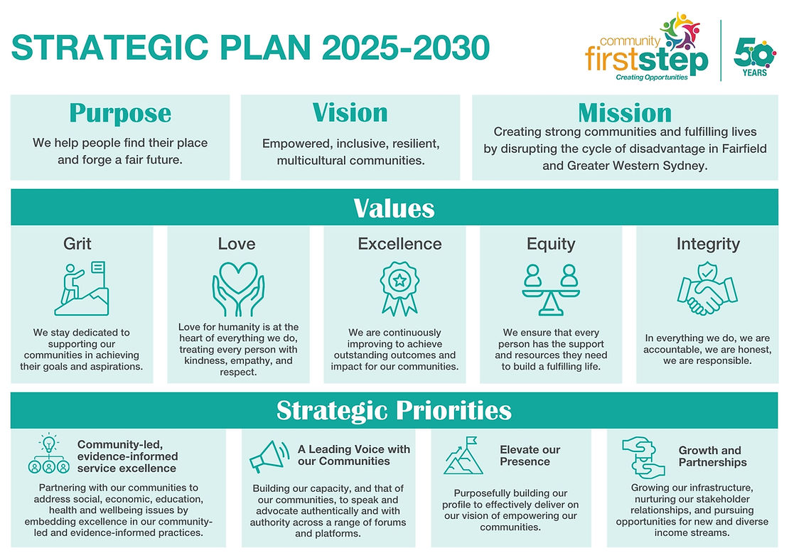 As a not-for-profit organisation supporting diverse communities in Fairfield and Greater Western Sydney, it’s essential that our direction stays grounded in real needs, shaped by lived experience, and responsive to emerging sector trends. This plan represents a shared vision: one that sharpens our focus, clarifies our priorities, and strengthens our capacity to create meaningful impact.